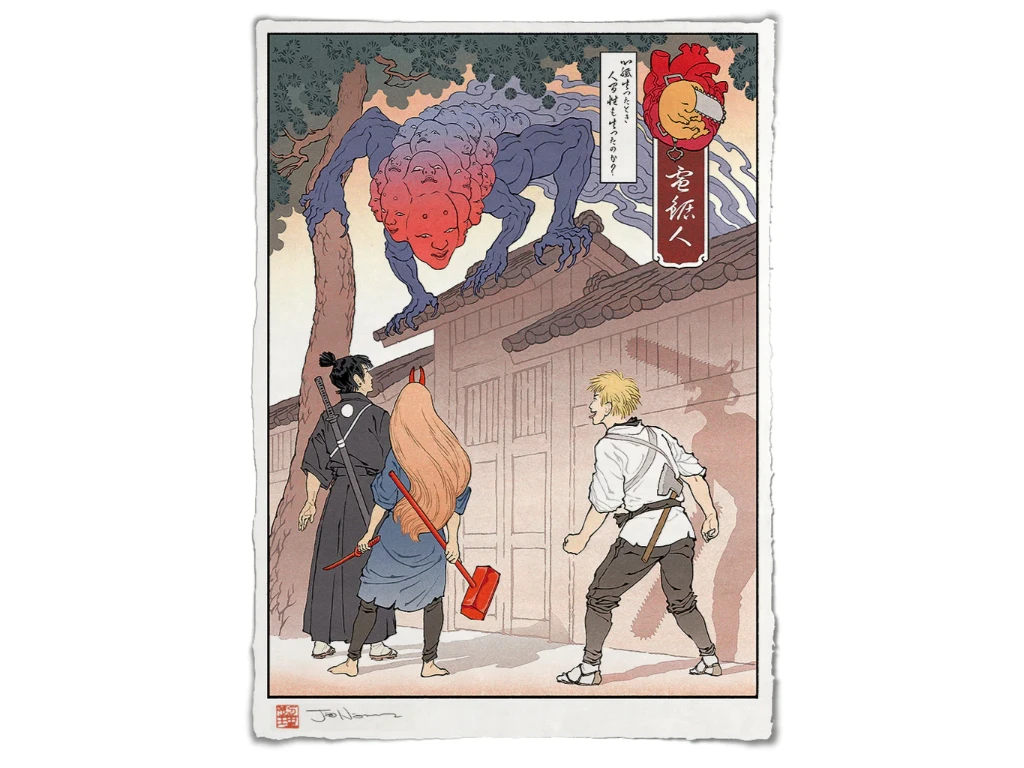 Quant au démon qui fait face aux personnages, il s’agit d’une création personnelle et non d’un personnage tiré du manga, dont les visages sont inspirés de masques de Noh traditionnel.