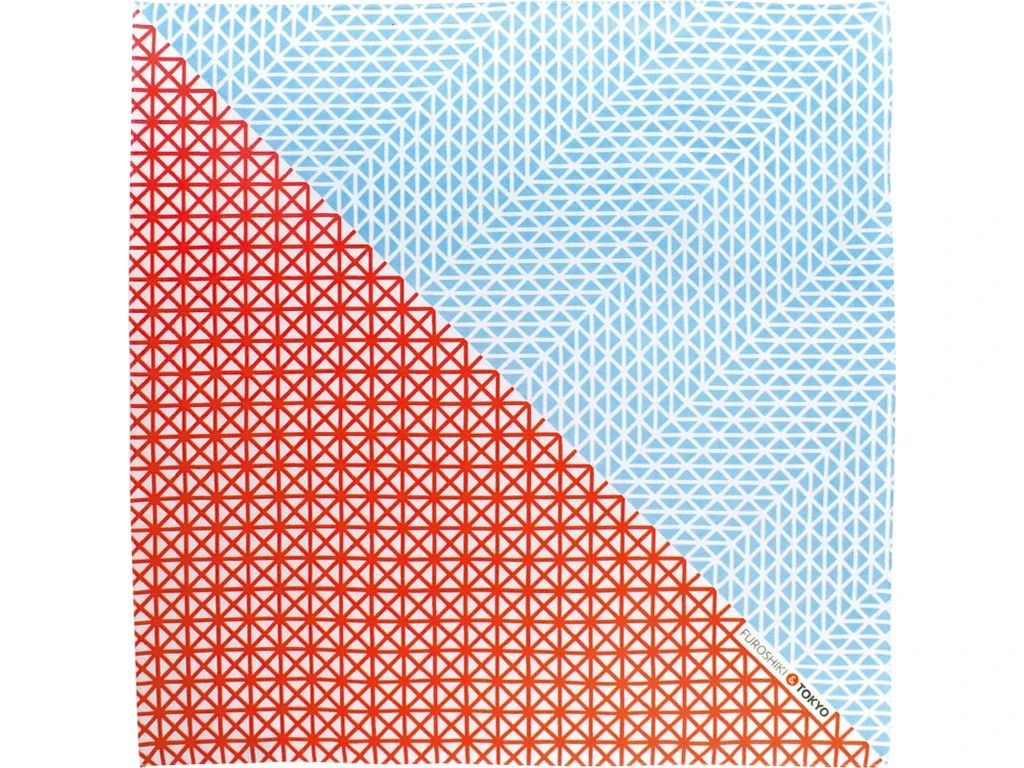 Ce furoshiki semble proposer des motifs triangulaires sur un fond bicolore. Mais ce sont en fait les symboles des deux tours emblématiques de Tokyo, la Tokyo Tower, d’une part, célèbre pour sa ressemblance avec la tour Eiffel nonobstant une couleur rouge flamboyante, et la récente « Skytree » aux reflets bleus, située juste à coté du vieux quartier d’Asakusa.