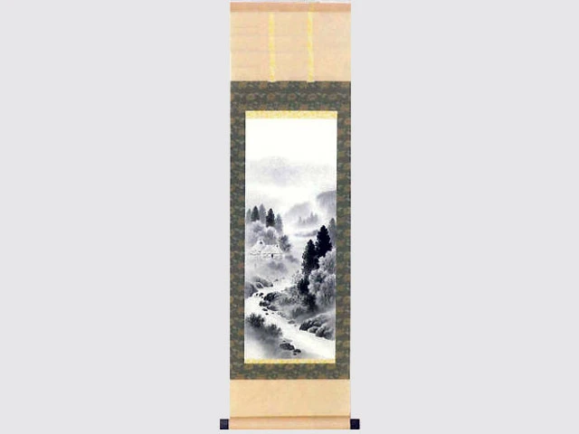 Ce kakemono présente une très belle reproduction d’un paysage à la manière des calligraphies anciennes.