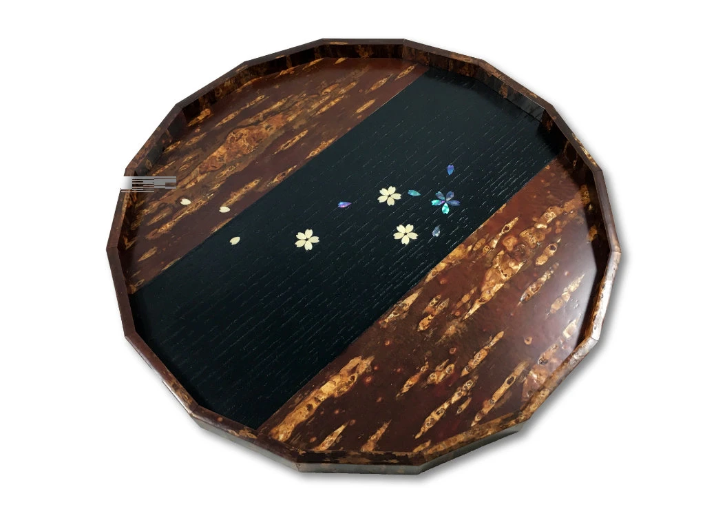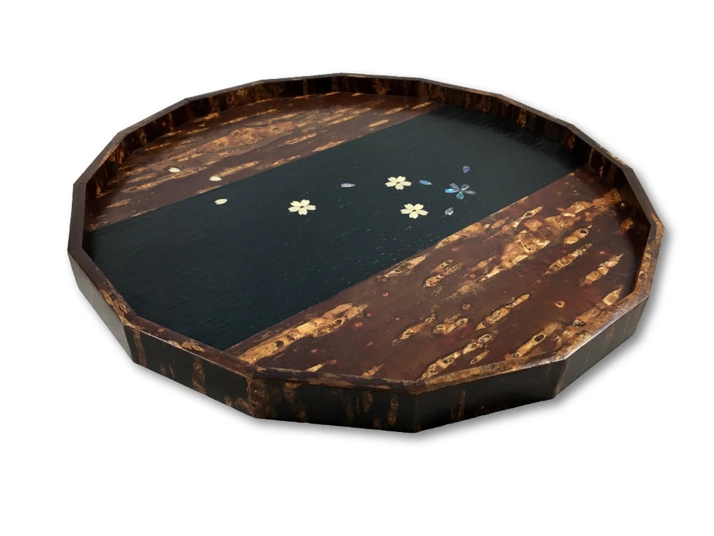 Associant l’aspect « sauvage » de l’écorce de cerisier polie, et une bande noire marquetée de nacre et de bois de cerisier prenant la forme de fleurs de cerisier, ce plateau manifeste une belle rencontre entre tradition artisanale japonaise et design moderne.