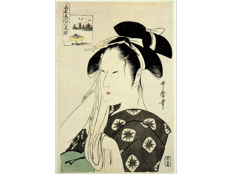 Nous vous proposons ainsi « La Veuve d’Asahiya » : Cette estampe de Kitagawa Utamaro (1753-1806) fait partie de la série des « 6 beautés de Edo » que l’artiste a réalisé. En raison des restrictions de l’époque, le nom de la dame est caché par un habile jeu de mot sur l’aube (asahi) et le nom des pierres du jeu de Go (goke).