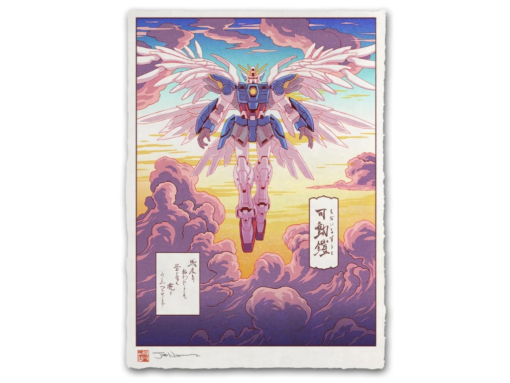 Cette décision lui a permis de conserver le design originel de l’armure du robot afin de renforcer encore plus le contraste avec un paysage nuageux dans le plus pur style des ukiyoe traditionnels.