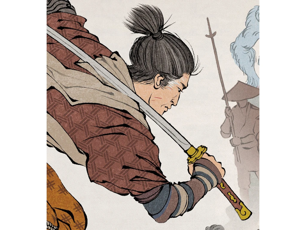 Pour cette estampe, Jed Henry s’est inspiré d’un jeu vidéo récent. Vous aurez peut-être reconnu « Sekiro », qui se déroule justement dans un univers de Japon médiéval cohérent avec l’esprit des estampes japonaises. Notez la manière dont l’ambiance de brouillard et de pluie fine est bien retranscrite!
