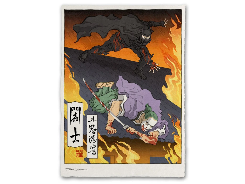 Si récemment un dessin animé s’est déjà amusé à mêler univers du Japon médiéval et le personnages de l’univers Batman, cette estampe est particulièrement réussie pour exprimer la folie du Joker et l’effroi du chevalier noir face à son ennemi de toujours.