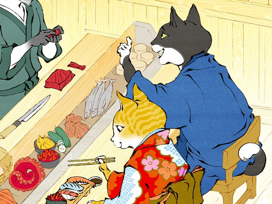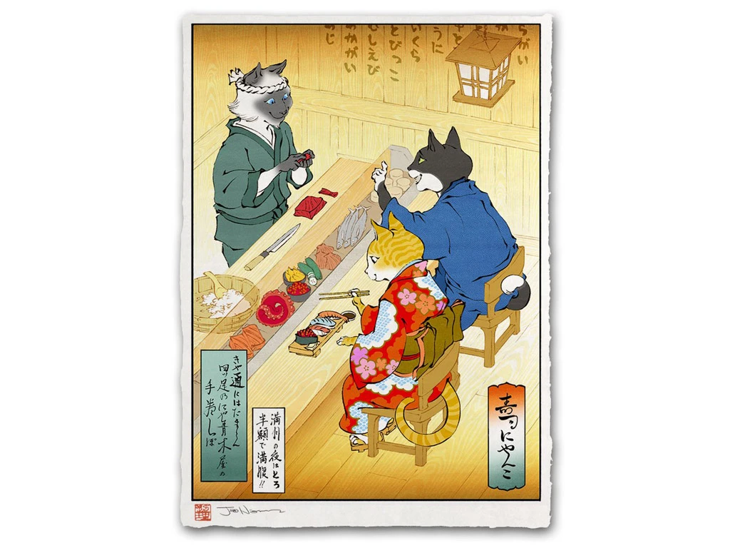 Les deux plus grandes obsessions du Japon sont les chats et les sushis. Pendant des siècles les artistes japonais ont dessiné des chats de toutes les manières possibles. Jed Henry a décidé de contribuer à cette tradition à sa manière et ça donne ça!