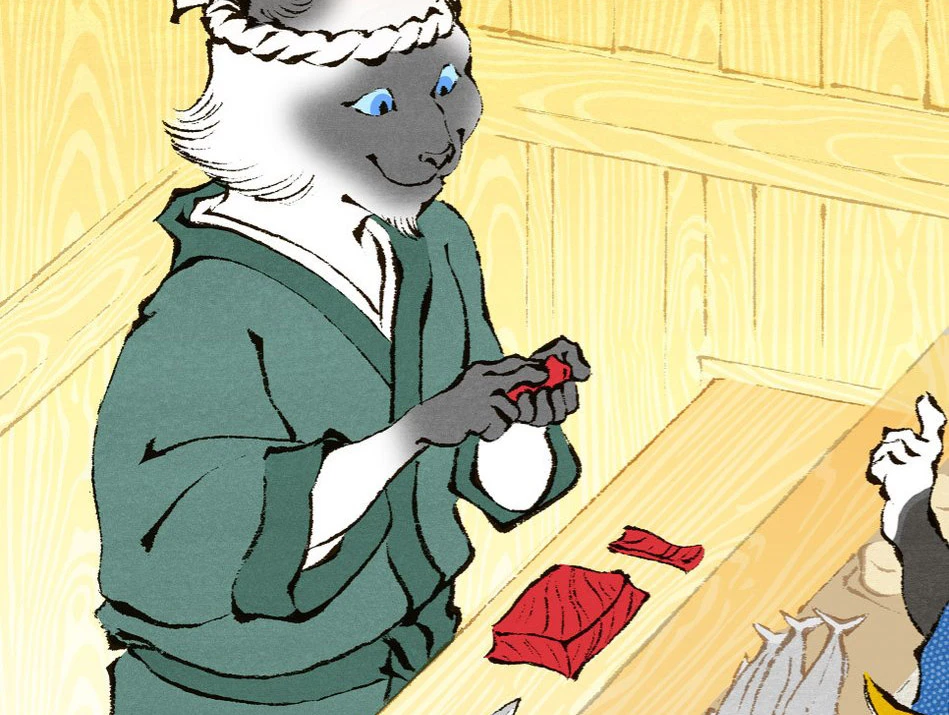 Le cartouche principal indique « sushi nyanko ». « nyan » est en fait la transcription japonaise de « miaou » et nyanko peut se traduire par « minou ».