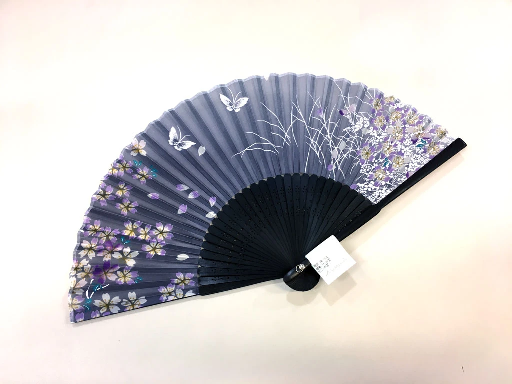 Eventail en tissu dĂ©corĂ© de jolies fleurs de cerisier (sakura en japonais) et d’un papillon en couleurs pastel sur fond bleu nuit d’une grande sobriĂ©tĂ©.