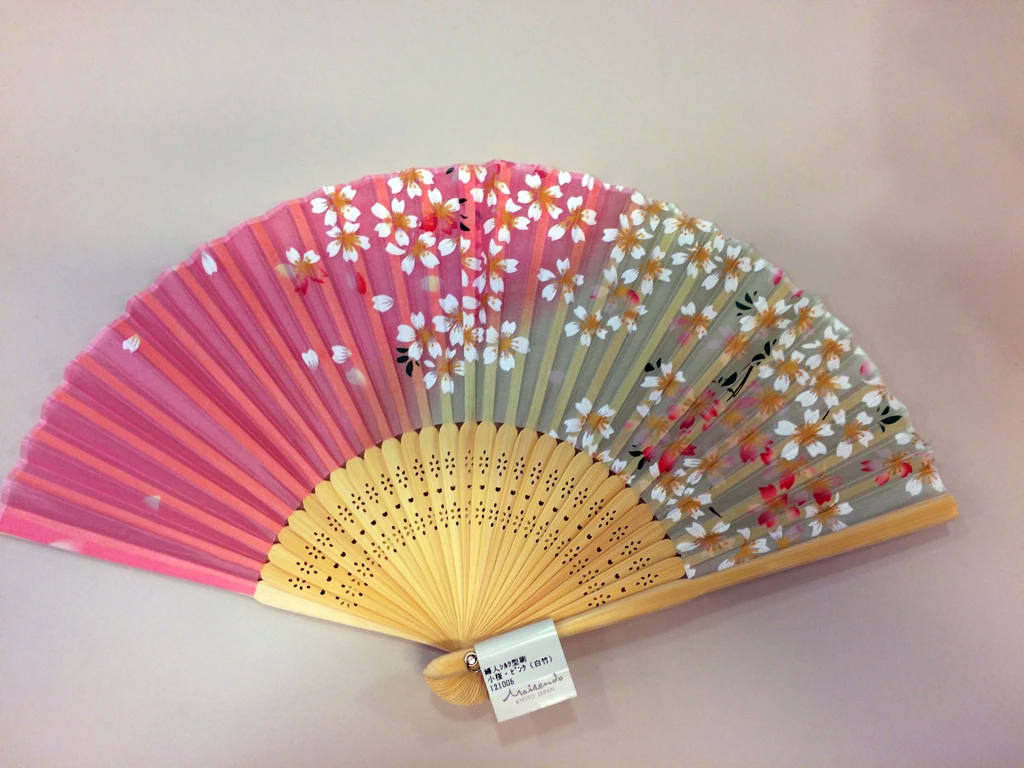 Eventail en tissu décoré de jolies fleurs de cerisier (sakura en japonais) sur fond vert & rose.