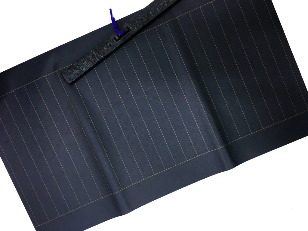 IdĂ©ales pour la copie de sĂ»tras, ces feuilles en washi ont Ă©tĂ© teintĂ©e en bleu indigo afin de mieux faire ressortir une calligraphie rĂ©alisĂ©e en « doré », que ce soit Ă l’or fin ou avec de l’encre dorĂ©.