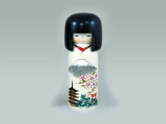 Grande Kokeshi dĂ©corĂ©e d’une belle reprĂ©sentation du mont Fuji entourĂ© de plusieurs symboles japonais (Torii, pagode, fleurs de cerisier).