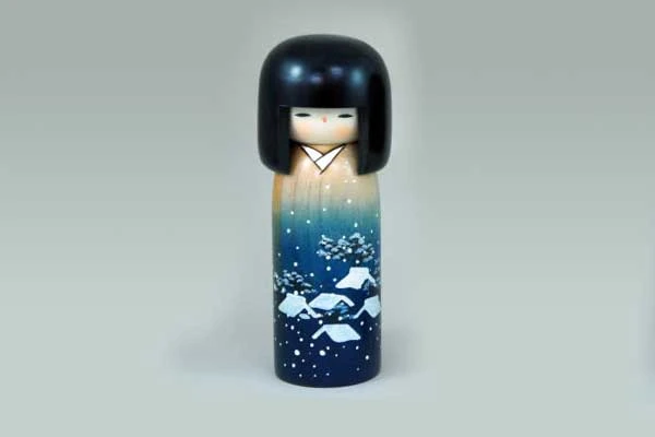 Kokeshi dĂ©corĂ©e d’un joli paysage « sous la neige ».
