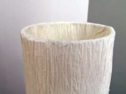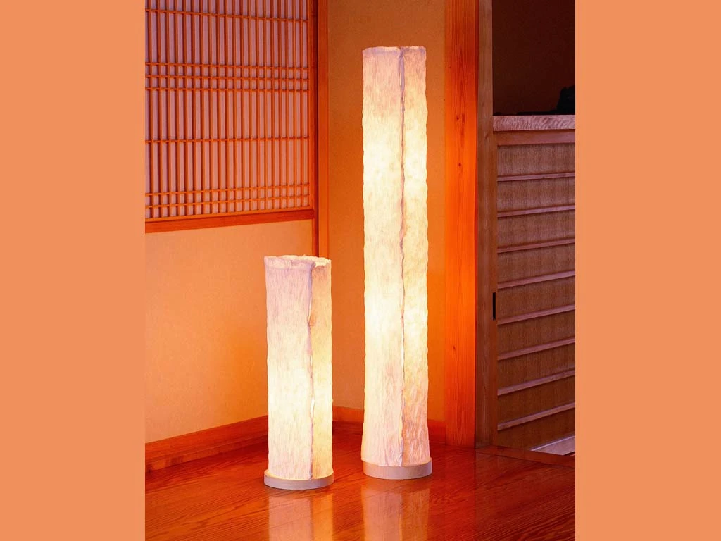 RĂ©alisĂ©e artisanalement par Monsieur Hayashi, cette lampe comprend un pied en bois surmontĂ© d’un cylindre de papier washi posĂ© sur une armature lĂ©gère. Le papier a Ă©tĂ© travaillĂ© afin de donner un aspect gauffrĂ© autant esthĂ©tique lorsque la lampe est Ă©teinte que du plus bel effet lorsqu’elle est allumĂ©e.
