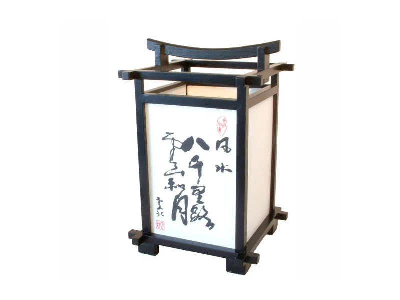 Lampe de chevet en bois et papier japonais (washi) dĂ©corĂ©e d’un blason (mon) japonais et surmontĂ©e d’une anse rappelant les torii shinto.