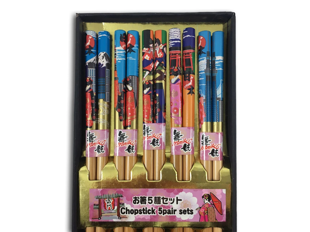Vous recevez du monde pour une sushi party? Pas de problème: Konjaku vous propose ce lot de 5 paires de baguettes assorties, décorées de jolies Geishas vous faisant visiter quelques monuments typiques de Tokyo.