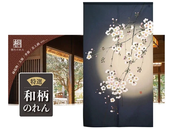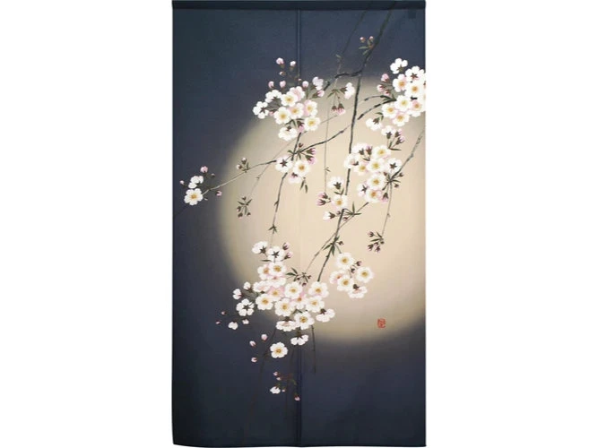 D’un beau gris anthracite, simulant une ambiance nocturne avec perfection, ce noren est dĂ©corĂ© d’une belle pleine lune dorĂ©e, entourĂ©e de quelques fleurs de cerisier (« sakura » en japonais)