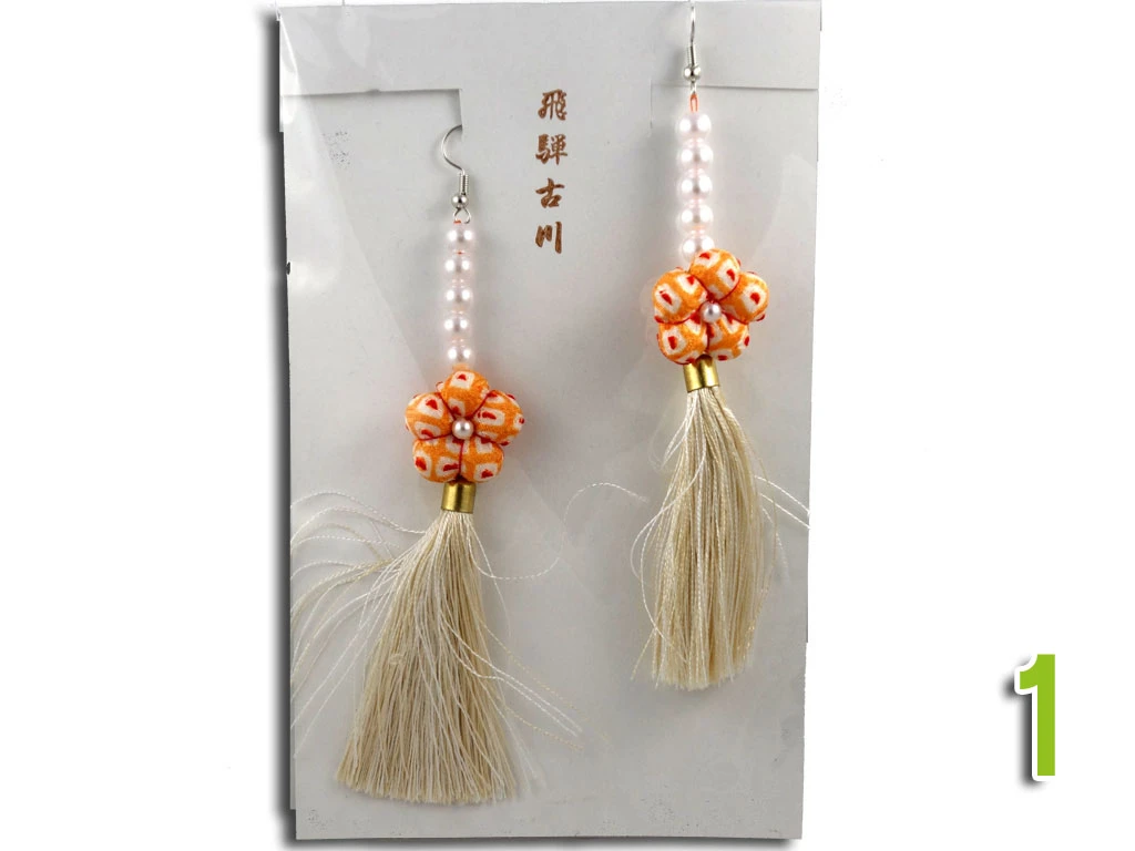 FabriquĂ©es Ă la main Ă Hida, dans les Alpes japonaises, ces boucles d’oreille sont rĂ©alisĂ©es Ă partir de tissu de kimono recyclĂ©
