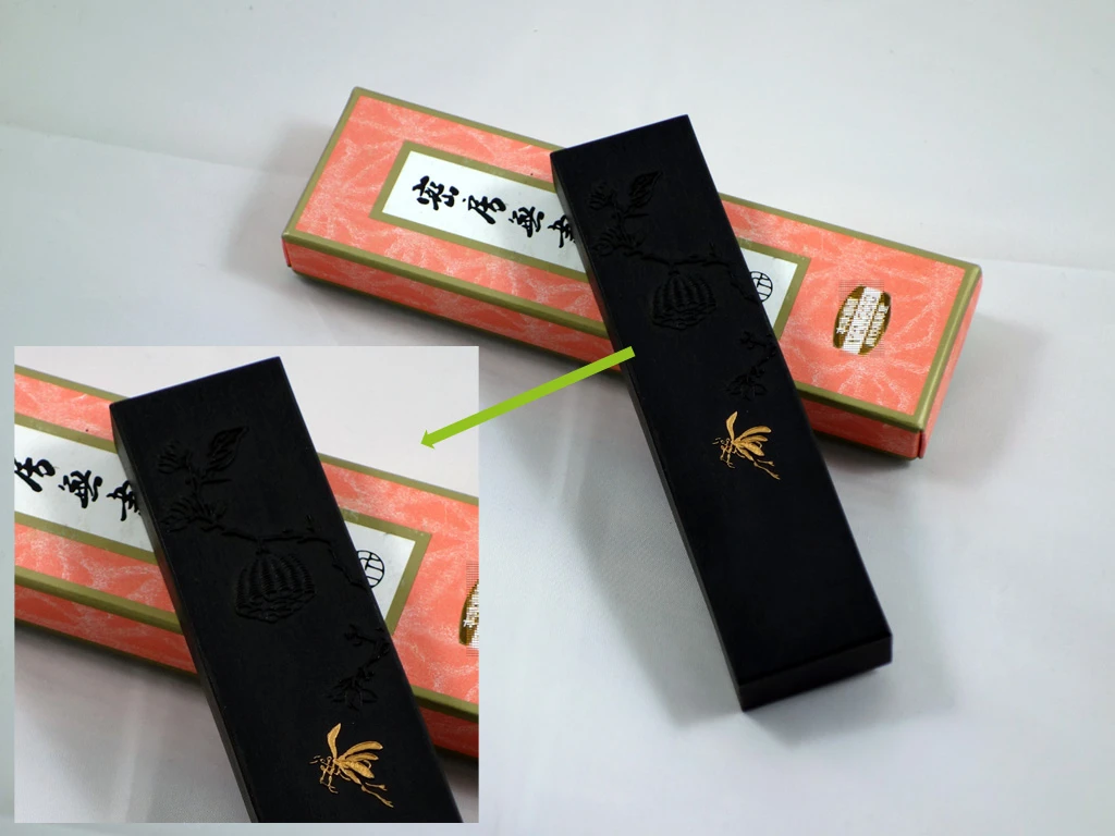 Konjaku vous propose ici une pierre de 75g aux dimensions de 12,7 x 3 x 1,5 cm environ, joliment dĂ©corĂ©e, comme le sont toujours les pierres d’encre de qualitĂ© au Japon.