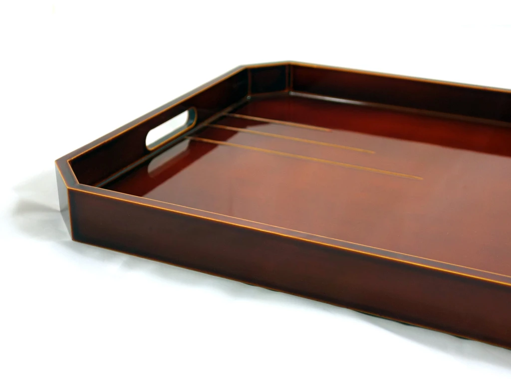 Ce joli plateau laqué associe une forme traditionnelle à un design épuré plus moderne: seuls trois traits viennent décorer la surface lisse de celui-ci.