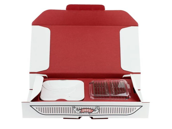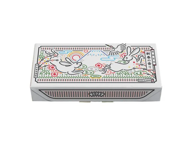 La décoration de la box renforce le message car elle porte différents symboles associés à la chance au Japon: le signe du zodiaque, le Mont Fuji, le premier lever du soleil, la grue, Sho Shiku Bai (pin, bambou et prunier) et Chidori (oiseaux de la victoire et de l’abondance).