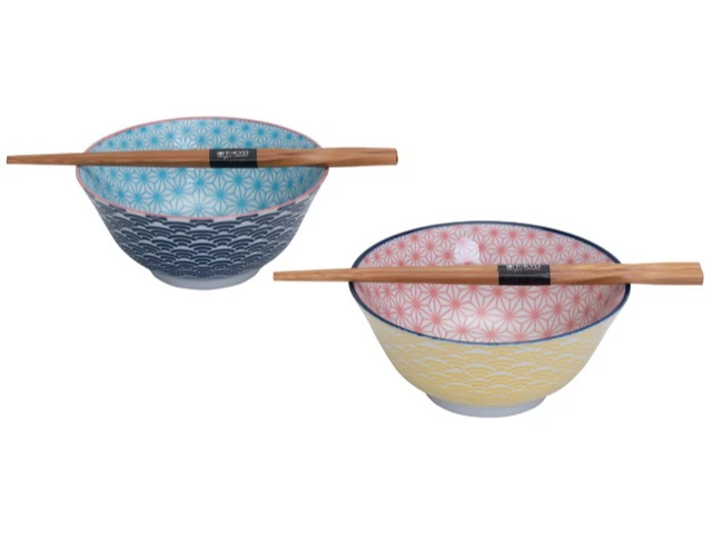 Le set comprend 2 bols de couleur différente, un bleu et un rouge/rose ainsi que deux paires de baguettes en bambou.