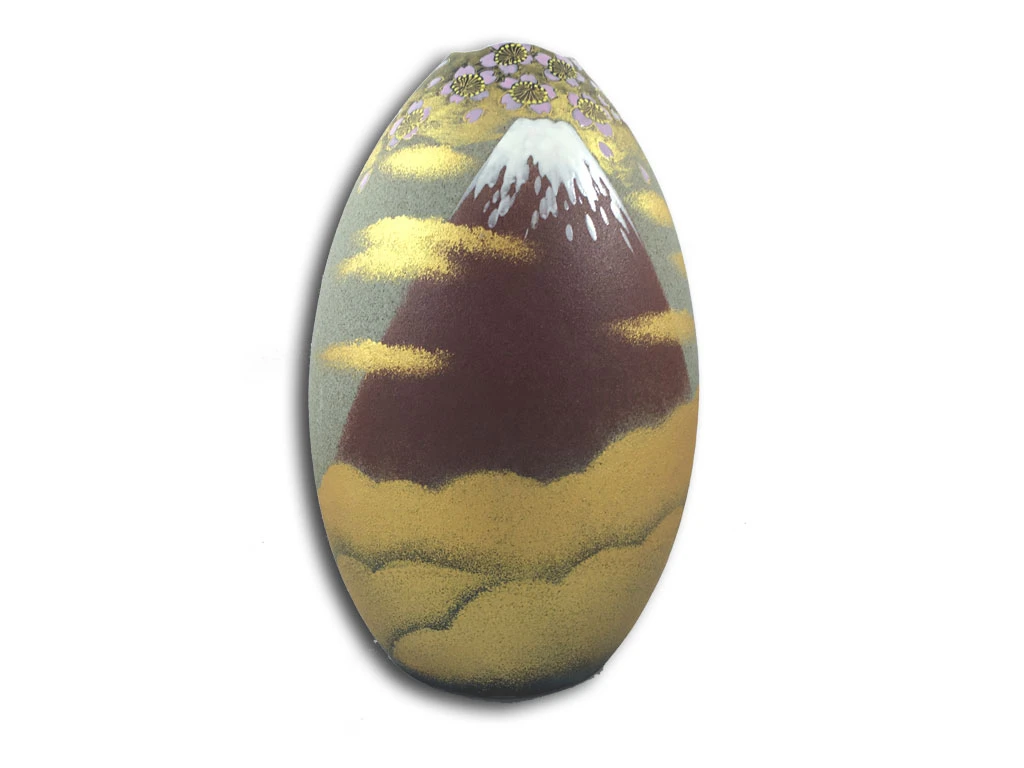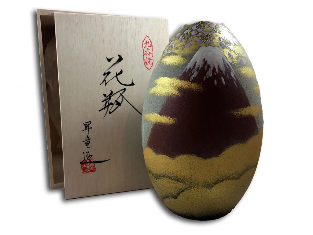 Ce très beau vase en est un bel exemple, présentant le célèbre Mont Fuji sortant des nuages, vu à travers la frondaison de cerisiers en fleurs.